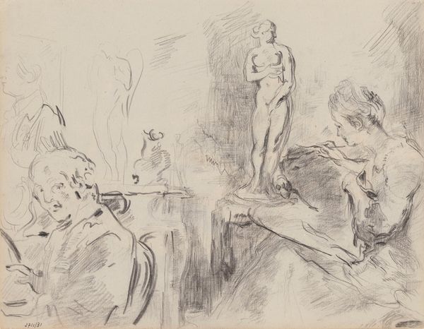 Editor: Jean-Louis Forain's pencil drawing, "Discharged from Military Service," believed to be from between 1914 and 1919, really evokes a somber mood. The quick, expressive lines give a sense of unease and uncertainty. How do you interpret this work within the historical context of its creation? Curator: This piece speaks volumes about the socio-political landscape following World War I. Forain, known for his social commentary, likely created this in response to the trauma and disillusionment experienced by soldiers returning home. Notice how the discharged soldier seems lost, almost vulnerable, while the figure behind him offers little in the way of obvious emotional solace. The very act of shedding the uniform represents a dramatic shift in identity, a reentry into a society forever changed by war. Editor: So the work challenges a purely heroic view of war, then? Curator: Precisely. Consider the intended audience and where something like this would be displayed. By portraying a soldier in such a state of undress and visible mental discomfort, Forain challenged prevailing narratives. Is he celebrating a return, or stripping the figure bare? Is he instead, laying bare society's expectations against the soldier's interior turmoil? The pencil drawing and sketchy, unrefined marks suggest instability, perhaps even mirroring the instability felt within French society at the time. Editor: It’s interesting how the rawness of the medium contributes to that sense of instability. It feels more like an immediate, unfiltered response than a carefully constructed statement. Curator: Exactly! The drawing itself becomes a form of political expression. The rapid sketch, combined with the social subject matter and historical background makes Forain’s criticism difficult to ignore. Is there anything else you see within that socio-political lens? Editor: Thinking about it now, I see how this artwork uses a moment of quiet intimacy to reflect larger societal shifts after a huge political event, the First World War. Thanks so much for clarifying the cultural nuances of this poignant sketch. Curator: And thank you for helping shed light on those visual cues and nuances. Considering both makes it so much more meaningful.