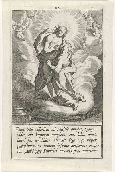 Cornelis Galle I created this engraving, “Marriage of Catherine of Siena to Christ,” sometime between the late 16th and mid-17th centuries. The print depicts a marriage ceremony between Saint Catherine and Christ, attended by the Virgin Mary, King David, and other religious figures. Considered alongside the context of Galle's life during the Counter-Reformation, the print serves as a powerful affirmation of Catholic orthodoxy, particularly concerning the role of female saints. Catherine of Siena, a Dominican tertiary, was known for her visions and profound spiritual experiences. Here we see those experiences made visible. Her mystical marriage to Christ symbolizes a deep, personal connection to the divine. This was a period when the Church sought to reaffirm its authority and traditions amid Protestant challenges. The emotionality of the scene, with its emphasis on Catherine’s personal devotion and divine connection, invited viewers to reflect on their own spiritual lives. The print not only immortalizes Saint Catherine but also reaffirms the spiritual power and agency of women within the Catholic faith.