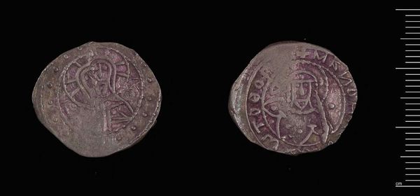 Curator: Today we're examining a Half-Stavraton, a coin crafted under the authority of Manuel II. Editor: It looks worn, doesn't it? But the imagery still carries a certain power, a sense of faded grandeur. Curator: Indeed. This coin, residing at the Harvard Art Museums, offers insights into the economic and political landscape of its time. Currency, after all, shaped power. Editor: The figures are so stylized, almost geometric. You can make out a halo on one side. I wonder what these icons meant to the people using it. Curator: Coins like these were not just about monetary value; they were tools of imperial projection, visual reminders of the Emperor’s authority circulated amongst the people. Editor: So, in essence, each transaction was a subtle reinforcement of the Emperor's image and rule. I see this coin as holding a narrative far beyond its size. Curator: Exactly. It highlights how everyday objects become carriers of potent symbolic and political meaning. Editor: It's a fascinating glimpse into how symbols shape and maintain power structures. Curator: It really is. It makes you wonder what future archaeologists will make of our own currency.