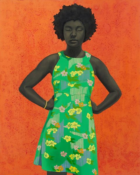 Editor: So, this is Kehinde Wiley's "Venus at Paphos," created in 2014. It's such a vibrant painting! The juxtaposition of the figure and the floral background creates a really striking image. What symbols or hidden meanings do you see here? Curator: Well, the title itself offers a strong entry point: Venus. That immediately draws on classical imagery. Think of Botticelli’s Venus, right? The goddess of love and beauty is almost always depicted with flowers and idyllic settings, emblems of fertility and pleasure. Wiley reclaims and reframes this iconography through his model, imbuing the Western ideal of beauty with contemporary Black identity. Editor: I hadn't really made that direct connection, but now I see it! The background really stands out. It seems almost like a wallpaper design, with sunflowers and these leafy patterns. Does that play into it, too? Curator: Absolutely. Wallpaper historically signifies domesticity, the private sphere, traditionally assigned to women. But sunflowers themselves symbolize adoration, longevity, and even false riches. Consider how that contrasts with the Western notions of female beauty represented by the Aphrodite archetype. Are we critiquing it or honoring it? Editor: So, it's like Wiley is layering these familiar images—Venus, sunflowers, and even wallpaper—to tell a new story, one that challenges our assumptions? Curator: Precisely! Look closely at the papaya, presented delicately in the figure's hand. What significance might that carry, especially in relation to cultural memory? Editor: Oh wow. Now I see the many levels in it! I need to do more research on symbolic history. Thank you so much for opening my eyes to this Curator! Curator: My pleasure. It's about how visual languages continue to shift over time and across cultures.