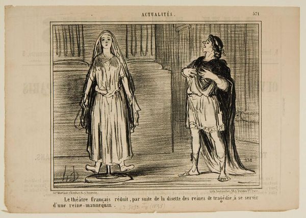 Curator: This lithograph, currently residing at the Harvard Art Museums, is by Honoré Daumier. The piece is titled, "Wait... If I had had time to get myself together...". Editor: It’s stark, almost pleading. The figure seems caught between a classical ideal and a very human sense of unpreparedness. Curator: Daumier often used his art to address social and political issues. Consider this work as a commentary on the hurried promises of liberty, perhaps. Editor: Yes! This feels especially relevant when we reflect on how liberation movements often demand immediate transformation without addressing the need for systemic change, for individuals to find their footing. Curator: Precisely. Daumier’s visual language really captures the complex, and often rushed, narrative of societal progress. Editor: It makes you wonder, what does it truly mean to be free, and at what cost is that freedom obtained?
