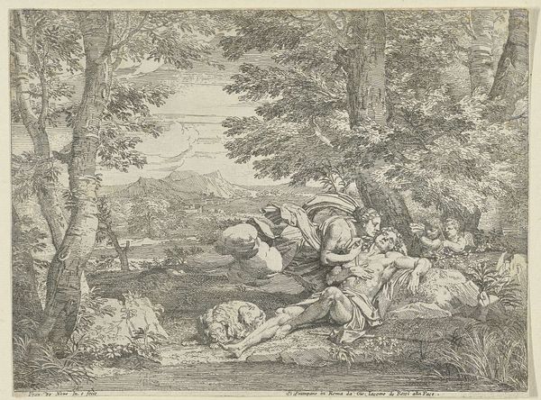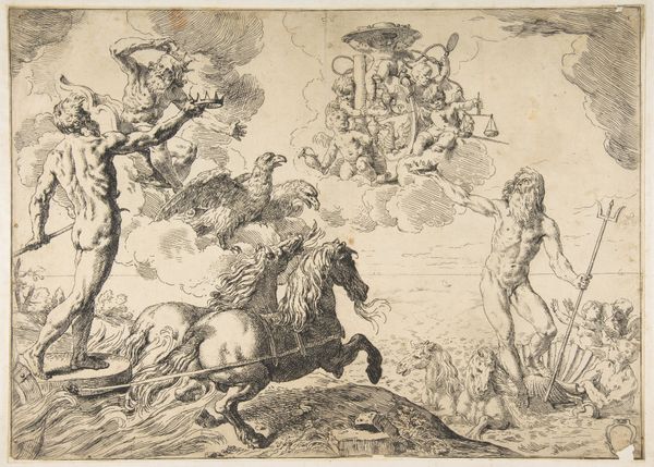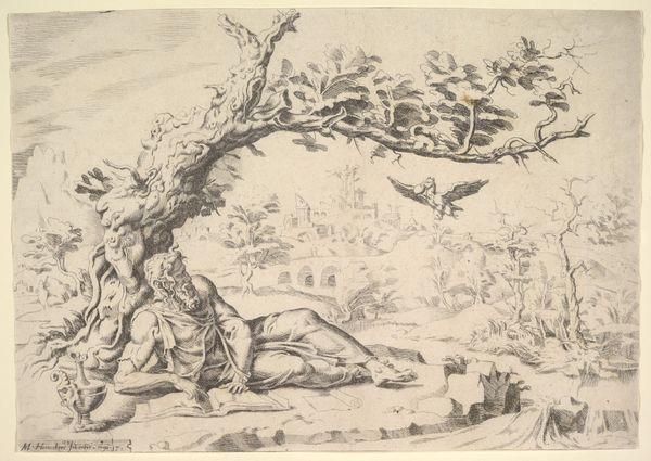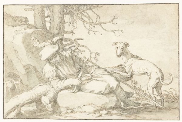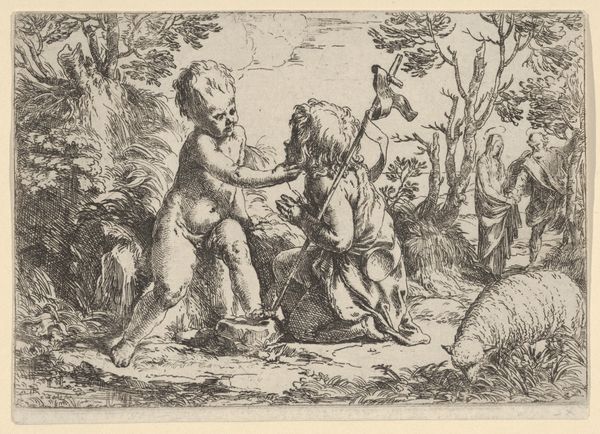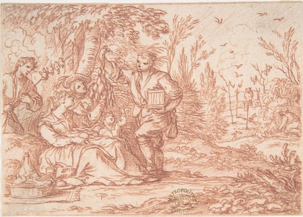 Curator: Willem van Oordt's drawing, "St. John the Baptist Pointing to Christ," created between 1630 and 1655, utilizes pen, ink, and charcoal on toned paper to present a key moment in Christian narrative. Editor: It's a beautifully composed piece. The subdued monochrome palette and delicate lines give it a feeling of both intimacy and timelessness. The light seems to be emerging from the figures themselves. Curator: Observe how van Oordt employs line weight to establish depth. The figures in the foreground, especially St. John, are rendered with darker, more emphatic lines, drawing the eye, while the figures further back are lighter, almost dissolving into the background. The composition is structured by this contrast. Editor: St. John's gesture, the pointing finger, is such a powerful, iconic symbol. It immediately signals his role as the herald, directing attention to Christ and, by extension, salvation. I see echoes of this motif across centuries of art and religious iconography. Curator: Precisely. And consider the subtle variations in texture. The rough strokes defining the landscape contrast with the smoother rendering of the figures' drapery. Van Oordt guides our perception by alternating these graphic marks to guide us through space. Editor: And think about the cultural weight this scene carries. The Jordan River as a site of baptism, repentance, and revelation, not only historically but symbolically, speaks to the idea of spiritual cleansing and new beginnings. I believe every element holds great weight. Curator: I concede that the semiotic analysis lends itself to a broader interpretation, but one cannot ignore van Oordt’s technique: the dynamism implied through line and shade to capture depth is exceptionally well considered. Editor: Seeing the emotionality behind van Oordt's mark making helps give an impact to the historical significance. Thank you. Curator: Likewise. Appreciating both context and craft enriches our understanding.