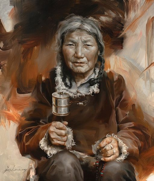 Kun Wang created “A Smiling Old Woman” using oil. The painting’s structure lies in its brushstrokes and tonal arrangement. The background dissolves into a blend of browns and grays, creating an ambiguous space that accentuates the figure’s presence. Wang’s choice of color is strategic; subdued tones give way to occasional accents like the red stripe on the woman’s sleeve, drawing our eye and anchoring the composition. The brushwork throughout is loose and expressive, suggesting movement and vitality, while the formal arrangement of planes and lines adds depth and complexity. Wang challenges the traditional portrait conventions, emphasizing the surface’s materiality. The very act of painting becomes as significant as the subject. The semiotic interplay of the signifier, the paint, and the signified, the woman, generates meaning that transcends simple representation. The artwork invites ongoing interpretation, embracing the instability of meaning in art.