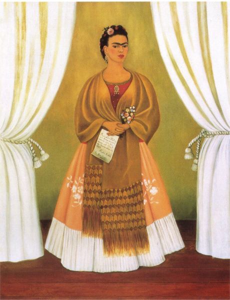 Curator: This is Frida Kahlo's Self Portrait with Small Monkey, painted in 1945. The composition immediately draws you in with the direct gaze of the artist, surrounded by symbolic animals. Editor: The colors are quite rich, especially the deep tones of her shawl and the vibrancy of the yellow ribbon that encircles the figures. I’m struck by the textured application of paint, giving a tangible quality to her clothing and the animals' fur. Curator: Kahlo often used animals as extensions of herself, and in this piece, the spider monkey, a symbol of lust or evil in some cultures, appears to be offering comfort. The xoloitzcuintli dog at her feet, a breed native to Mexico, represents a connection to her heritage. Editor: The way the light falls on her face, highlighting her iconic unibrow and the slight curve of her lips, creates an intense emotional presence. It feels both vulnerable and powerful, a very deliberate construction of self. Curator: Absolutely. The meticulous rendering of each element speaks to her profound engagement with her personal narrative and the materials she used to express it. Editor: It’s a compelling portrait that invites us to delve into the artist's inner world through careful observation of her visual language.