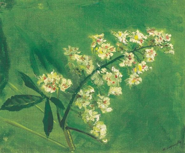 Curator: Here we have “Almond Tree in Blossom,” painted by John Peter Russell around 1887. It's currently held here at the National Gallery of Victoria, in Melbourne. What are your initial thoughts on this evocative piece? Editor: A whisper of spring, I'd say. Those blossoms bursting forth... it feels simultaneously delicate and persistent. A touch melancholic, perhaps? The olive green backdrop isn't exactly cheery. Curator: Interestingly, almond blossoms have often symbolized hope and rebirth in various cultures. Think of the early flowering almond tree breaking the bleakness of winter, a powerful visual metaphor adopted over centuries, offering encouragement during hardship. Editor: Rebirth, huh? I dig that. Though my eye keeps bouncing between the vibrant whites and that muted background. It almost feels unresolved, a season in transition caught on canvas. The composition's almost unsettlingly asymmetrical as well. A lot happening off to the left side... Curator: Russell was exploring Impressionistic techniques, observing fleeting moments in nature. Consider also how the plain-air tradition allowed the painter to capture natural phenomena outside the rigid environment of a studio, trying to emulate reality more vividly. The asymmetry might also symbolize that nothing in life is perfect, not even in an idealized landscape, or even the beginning of the season we usually romanticize. Editor: Yeah, totally seeing the impressionistic thing—brushstrokes creating form, not defining it. And you’re right—something real about that off-balance composition. Maybe it's a little shout-out to imperfection, a nod to things not quite aligning neatly. That brown color works almost like an early dawn where colors struggle to emerge out of darkness. Curator: It reminds us of nature's beautiful, messy, persistent urge to keep blossoming. There is a silent but firm invitation to hope. Editor: Precisely. A painting of subtle promise rather than outright joy. Food for thought, for sure. Curator: Indeed, thank you. A moment's pause amidst the blossoms certainly offered an evocative exchange!