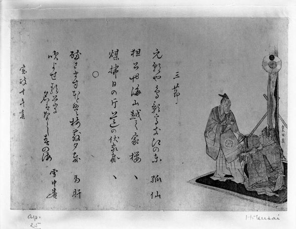 Editor: Hokusai's "A Scene of Filial Piety: GomÅ," a small paper print, feels so intimate. I’m struck by the depiction of domesticity. What can you tell me about the social context of this artwork? Curator: This print reflects the Edo period's emphasis on Confucian values, especially filial piety. How might the print have functioned as a form of social commentary, or even propaganda, promoting these ideals to a broader audience? Editor: Interesting. So, it's not just a snapshot of daily life, but a piece intended to reinforce certain societal norms? Curator: Exactly! The image normalizes and celebrates specific roles within the family and community. Think about the power of visual media in shaping public opinion, even back then. Editor: That makes me consider the intentionality behind this work and its role in shaping cultural values, it’s more than just a simple scene.