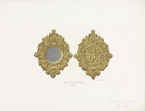 Editor: Here we have Tulita Westfall's watercolor drawing, "Brooch," created around 1937. There's a stark elegance to it, even in its simplicity. The golden filigree makes me think of Byzantine jewelry. What story do you think this work is telling? Curator: To me, this drawing is whispering about the intersection of high design and personal adornment. Think about it – the geometric precision rendered in delicate watercolor! There's this dance between a cold, calculated plan and the warm, human touch. It’s almost a longing for a connection. Do you see the way Westfall includes those extra side views, like little secrets? Editor: I do! It's almost like she's saying, "Look closer, there's more to this than meets the eye." But does it speak to the social context of the time, perhaps a yearning for luxury during the Depression? Curator: Exactly! There's an undeniable tension – a desire for beauty, a need for escape, all tempered by the economic realities of the era. But more than that, maybe it’s about dreaming, pure imagination taking tangible shape on paper, daring us to dream along with it. What kind of woman do you picture wearing this imagined treasure? Editor: Someone bold and confident, perhaps an artist herself. It's fascinating how a simple drawing can evoke such a rich tapestry of ideas. I appreciate how you've linked Westfall’s imagined treasure with the social conditions and longing for escape during the Depression era. Curator: It all speaks to a truth: Art, no matter the medium, is always in conversation with its world. It invites us into that conversation.