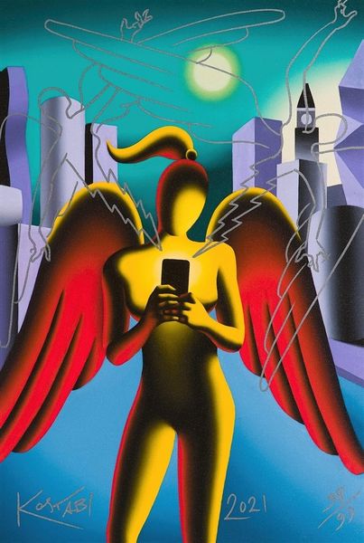 Editor: So, we're looking at "Metropolitan" by Mark Kostabi, painted in 1995. It seems to be acrylic on… something, probably canvas. The mood is kind of eerie, wouldn’t you say? All these cool blues and purples... Almost voyeuristic. What do you make of it? Curator: Voyeuristic is a strong word… but not entirely inaccurate. Kostabi often played with this detached, observational stance. Think about how the figures are presented: almost mannequin-like, devoid of individualized features, set against this stark, stylized cityscape. I wonder if he's trying to convey the isolation inherent in modern metropolitan life? It's as if we are all players in this silent, somewhat absurd theater of urban existence, mirroring each other without ever truly connecting. What is reflected and what is observed? Do we reflect, in our lives, the cityscape outside? Do we connect through simple, possibly pointless, observation? Editor: I never thought about it that way. So the anonymity isn't a bug, it's a feature? Like, we're supposed to see ourselves in these figures? Curator: Precisely. And consider the palette - the intense blues contrasted with the warmer hues. This evokes a sense of unease and perhaps longing, mirroring our ambiguous relationship with the city. There is a city and also a stark, sparsely decorated apartment interior. There are relationships but perhaps only loneliness. Even the cityscape feels…impersonal, reduced to geometric forms. Are we really that alienated, despite being crammed together? Or are we creating a kind of postmodern connection through observation? Editor: Wow, I am so different about this painting than I did before! So much for 'just a painting'. It makes one reflect on living in a society of voyeurs who have perhaps have become so lost to the beauty of simple interaction. Thank you so much for providing such fascinating insight! Curator: My pleasure! It’s funny how much a change in perspective can enrich a piece.