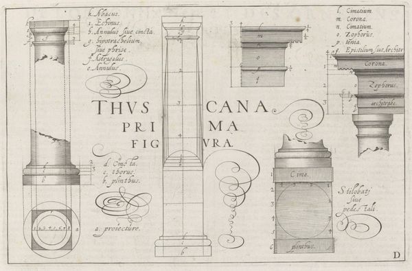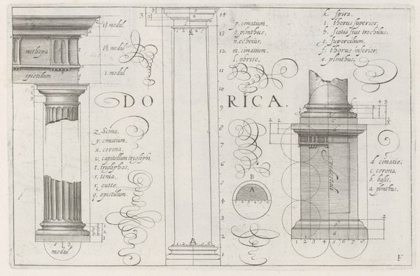 Curator: Let’s turn our attention to Hendrick Hondius I’s “Composiete details,” a drawing and engraving dating from the period 1606 to 1620, found here at the Rijksmuseum. My initial reaction is one of awe at the intricacy, particularly of the curling flourishes that adorn the piece. Editor: Indeed, there is a real precision here; I am particularly drawn to considering what Hondius would have been thinking about as he constructed these components—literally, composing the parts to the sum of the construction. This goes back to the ways prints, drawings and architecture influence each other. Hondius' work sits at that very intersection. Curator: The composition exemplifies the Baroque preoccupation with detail and the dramatic interplay of forms. See how each fragment, whether "Corona," "Capitellum," or "Basis," meticulously captures architectural elements through line and shade, while it showcases the very specific proportional logic inherent within this vocabulary. The lettering and annotations only enforce this didacticism. Editor: Absolutely, it is essentially a construction manual page. I keep considering his access to various stone materials, and the sheer physical labor that all of this implied— not just his own crafting with the drawing itself, but the very material conditions under which these idealised forms became a reality. How accessible was, say, marble to builders working within this broader Dutch context? Curator: A compelling question, no doubt. But perhaps it underscores the drawing's status as a speculative exercise. Hondius delineates architectural principles; accessibility to actual materials may have been secondary to the articulation of ideal forms. These proportions transcend any earthly stone. Editor: I see your point—though I struggle to fully detach form from its intended execution, the materials he envisions give context to these drawings. If these forms cannot be properly realized, what exactly are we to think of their aesthetic impact beyond the page? Curator: Well, to my mind, the legacy and study is not material, but ideal! Think about what these diagrams tell us about enduring structural and stylistic values, values far exceeding mere practicality or implementation of current availability of materials and craftmanship! Editor: Ultimately, these questions really reflect how his meticulous style offers so many angles into this visual, spatial language from Hondius and his peers— I do appreciate that aspect. Curator: Yes, it is this multifaceted engagement that lends enduring value to Hondius’s endeavor.