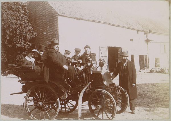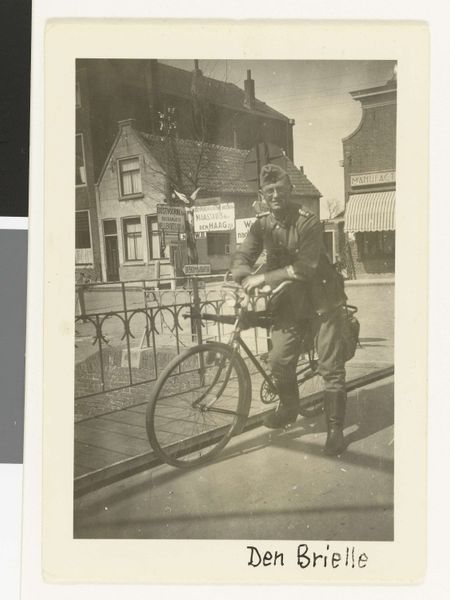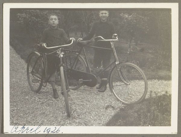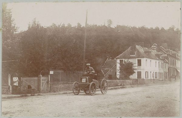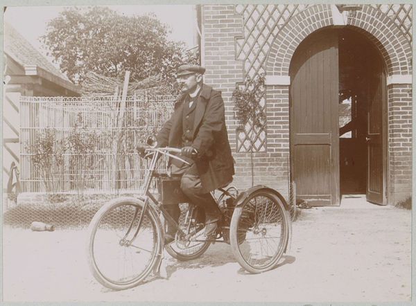 This photograph, "Man standing next to a tandem in Lisieux," was created by Delizy. The image captures a moment of personal mobility and leisure in a specific social context. During the late 19th and early 20th centuries, the bicycle became a symbol of freedom and independence, particularly for women. It challenged traditional gender roles and allowed women greater mobility and autonomy. Here, the man stands proudly next to his tandem bicycle, dressed in a suit and cap, suggesting both his social standing and participation in this new form of recreation. The setting of Lisieux, with its picturesque architecture, enhances the photograph's charm and evokes a sense of timelessness. The tandem bicycle itself speaks to collaboration and partnership, hinting at the social dynamics and relationships of the time. Ultimately, the image invites us to reflect on the intersections of technology, leisure, and social identity. It highlights the ways in which personal experiences are shaped by broader cultural and historical forces, reminding us of the ongoing negotiation between tradition and modernity.