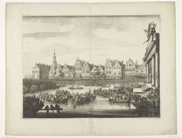 Salomon Savery created this etching in 1638, portraying the 'Steekspel in boten bij het drijvende theater op het Rokin', a tournament on boats at the floating theater on the Rokin. It's a window into the cultural spectacles of the Dutch Golden Age. Savery's image captures a moment of public festivity, reflecting the societal values and entertainment of the time. Yet, the composition also subtly hints at the socio-economic structures underpinning such displays. The elite, marked by their elaborate attire, engage in playful combat, while the masses observe from the riverbanks and boats, their presence essential to the event's significance. Consider how the architecture looms in the background, a solid, classical statement of civic power, contrasting the fluidity of the water and the pageantry unfolding upon it. Savery’s work isn't just a record; it's an invitation to ponder the relationships between performance, power, and spectatorship in a society navigating its burgeoning global influence.