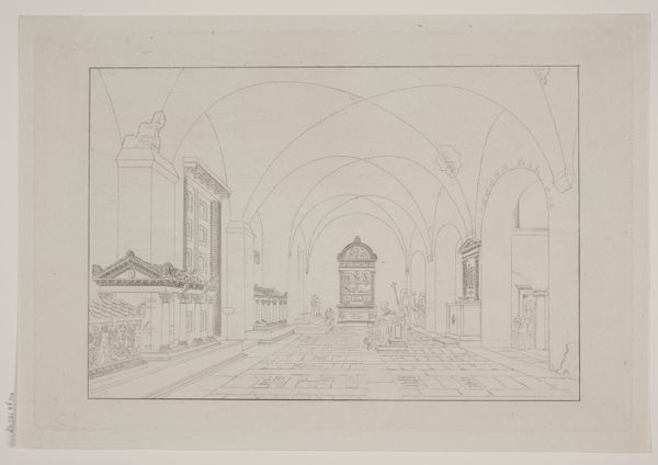 Editor: So, this is Christen Købke's pencil drawing, "Galla Placidias' grav i St.Nazareo Capel i Ravenna" from 1838, currently held at the SMK. The scene depicts the interior of a chapel; it has a sort of quiet, contemplative feel to it. How do you interpret this work, considering its historical context? Curator: This piece offers a glimpse into 19th-century Neoclassicism and its preoccupation with historical spaces, but it's crucial to consider it through the lens of power and representation. Köbke’s rendering of Galla Placidia's tomb isn't merely a neutral depiction. What sociopolitical ideas do you think the artist was possibly thinking when deciding to include a figure that appears to be sketching? Editor: I hadn't really considered that, but maybe that artist within the drawing stands for the artist interpreting or appropriating history? And the choice of the chapel could speak to issues of religious authority? Curator: Precisely! The artistic choice directs us towards critical inquiries about how such sacred spaces become objects of artistic study, how the stories they hold are told, and whose voices get amplified in the process. Who was Galla Placidia and what do we know about her? Does she have a place here? And, further, who can control how legacies live on? Editor: That's a great point, I think looking into Placidia's role as a woman of power would certainly add layers to this piece! It also challenges my initial assumptions about its serenity and points to larger social implications. Curator: Exactly. It prompts us to question whose narratives dominate our understanding of history and art. We should remain critical. Editor: It certainly will impact how I look at this work from now on, it will be from a very different perspective! Thank you.