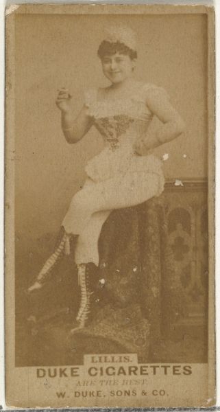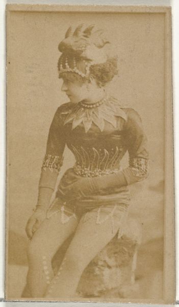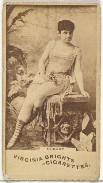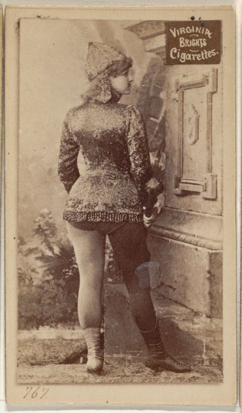 Curator: Here we have an interesting example from the late 19th century: a photographic print of Mlle. Bie from Paris, taken as part of the "Actors and Actresses" series produced by Allen & Ginter for Virginia Brights Cigarettes. Editor: Immediately striking, isn’t it? There’s a theatrical flair, and the sepia tones evoke a sense of nostalgia and perhaps a touch of the risqué for its time. The cigarette advertisement pairing feels unexpectedly forthright. Curator: The theatricality comes from the conscious construction of image; the way she strikes a performative pose upon a stylized pillar reflects popular conventions of portraiture meant to elevate the sitter. The figure embodies transformation—don't you see the symbolic potency there? Editor: I’m more curious about the process of image production at play here. The deliberate material conditions reveal an interesting intersection of entertainment, consumer culture and industrial methods of mass production through photography and print media in the 1880s. It gives it context and changes its purpose, in my opinion. Curator: Well, let’s not forget that popular actresses signified aspiration, their images embodying ideals that women perhaps hoped to attain in some fashion. They occupied an almost mythic place within the cultural imaginary. That's especially clear, knowing this image came to be circulated with commercial packaging. It signals the dreams associated with modernity and leisure. Editor: You’re right about that interplay. Still, these cards functioned as miniature commodities themselves, cheap but desirable. The cigarette brand’s image became fused with those ideals and celebrity, shaping the culture and driving profit. Curator: Consider how many layers of social influence are embedded in one single card: advertising, celebrity worship, aspirations, visual codes borrowed from "high" art—all coalescing to generate an alluring fantasy. Editor: Precisely! What feels old-fashioned to us now actually highlights this crucial transition to mass production and a budding advertising industry. The materials speak to a social shift as much as Mlle. Bie’s image might speak to the audience today. Curator: I'm left pondering the echoes of cultural values and what continues to beguile and bind us in a never-ending cycle of images, ideals and self-fashioning. Editor: And for me, I see how understanding these overlooked or marginalized items gives us richer understandings of economic shifts, advertising and their impact on how identities were forged.