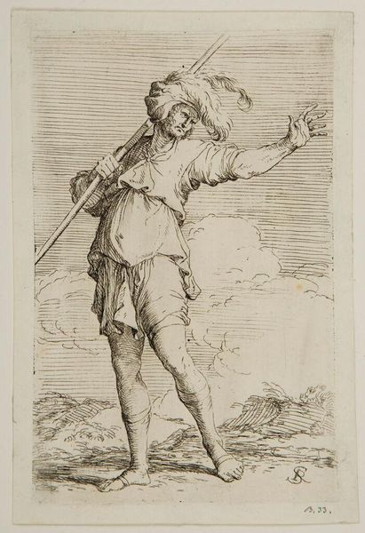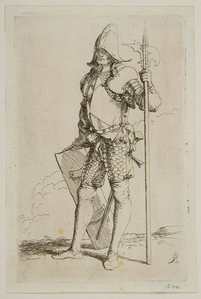 Editor: This is Salvator Rosa's "Two Soldiers," a print from the Harvard Art Museums. The detail is incredible, almost frantic, giving a sense of unease. What's your take on this piece? Curator: Rosa was quite interested in the theater of war. These aren't idealized heroes, are they? More like the gritty reality. Note how the printmaking medium lends itself to that sense of immediacy and rawness. How do you think this challenges traditional heroic portrayals of soldiers? Editor: I see what you mean. They're not posed or stoic. It's like a quick sketch of soldiers in a chaotic environment. It's fascinating to see this different perspective. Curator: Exactly. Rosa used printmaking to democratize art, making images like this more accessible and thus shifting the visual narrative around warfare. Editor: That's a powerful way to look at it. Thanks for pointing that out!