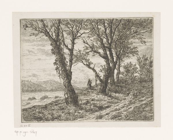Editor: Right, let’s dive into this etching by Wijnand Otto Jan Nieuwenkamp. It’s called "Vellen van iepen aan de Zuidervesting te Edam," which translates to something like “Skins of Elm Trees at the Southern Bulwark in Edam." Made between 1912 and 1915. What catches your eye? Curator: It’s terribly evocative, isn’t it? Those stark trees against that pale sky, the intricate, almost nervous lines… It's winter made visible, somehow. I feel a chill just looking at it. Editor: Absolutely. And considering Nieuwenkamp's own background, we can read so much into it. His extensive travels through the Dutch East Indies, his later affiliation with the Dutch Ethical Policy... It’s hard not to view even a simple landscape as a statement on colonialism, exploitation, even loss. Curator: Loss…yes! I agree. The stripped trees, the rawness…they definitely suggest something beyond mere landscape. There's a rawness about the forms, especially the trees. A sort of brutality? Or is it strength in survival? The texture achieved through etching… It feels very physical to me. Editor: Right, the "skins" of the trees, as the title suggests, feel vulnerable, peeled back, and exposed. Perhaps referencing the exploitation of resources, or even a comment on the rapidly changing landscapes in the Netherlands at the time, in relation to modernization and urban expansion? And consider the absence of people—only the architecture, which could be a deliberate statement about labor relations, land ownership, and structures of power. Curator: You're seeing politics, I see ghosts. The empty spaces, the tangled branches, the starkness... To me, it speaks more of memory and melancholy, of a past lingering in the present. A touch romantic, maybe? But also a bit…menacing. It makes you wonder, what narratives are the buildings hiding, you know? Editor: Well, perhaps art finds its fullest form at this intersection – where memory meets the sociopolitical realities. But either way, the history behind how this came to be surely influences how we read those ghost stories that you pointed out. Curator: I think I see it now: that dance of personal experience, historical burden, etched in stark lines. I wonder what a poem written from these landscapes would be like? Editor: And I can't help but think about the unseen laborers whose presence and lives shaped Edam as Nieuwenkamp encountered it and sought to represent. A visual reminder to seek them in the history. Curator: An agreement, then. Something more than what meets the eye.
