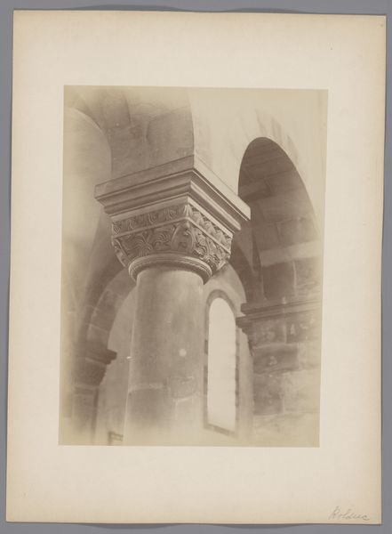Curator: We're looking at "Detail van de poort van de St. Fortunatus Abdij te Charlieu" by Adolphe Giraudon, a photograph dating between 1850 and 1900, housed right here at the Rijksmuseum. Editor: Wow, that's incredibly intricate. It’s almost haunting, that stark black doorway surrounded by all that detailed carving. It feels weighty and like I am peering back in time. Curator: Precisely. Giraudon captures the Romanesque style of the abbey with a meticulous eye, highlighting the architectural details through his lens. Notice how the textures of the stone are rendered, inviting contemplation on the cultural memory embedded within this religious site. The social implications of Romanesque architecture during that era were of piety and social hierarchies and their connection with landscape. Editor: I like how you framed that, memory. The craftsmanship is remarkable, really; all those little figures and geometric patterns surrounding the portal, caught in what feels like this liminal sepia-toned state. Curator: And, how might we interpret the darkness of the doorway itself, particularly in relation to gendered architectural discourse that often codes interior spaces as feminine? How do these spaces invite, or perhaps prohibit, participation of differing intersectional identities? It encourages conversations that engage historical contexts with today's sociopolitical discourse. Editor: See, that's where you lose me a little! It just seems to want to draw you in! What’s behind that door, you know? What secrets are locked away? It’s mysterious, almost gothic in that respect, even though we know it is from the Romanesque. It just evokes those sort of moods in me. I think about ancient rituals. Curator: Such contrasting readings only show how multifaceted Giraudon's photograph remains, even to this day. We can analyse it as both document and, dare I say, political evidence through close readings situated intersectionally. Editor: Absolutely. The magic is how that door into stone is now also a door into a really evocative conversation with each other, too!