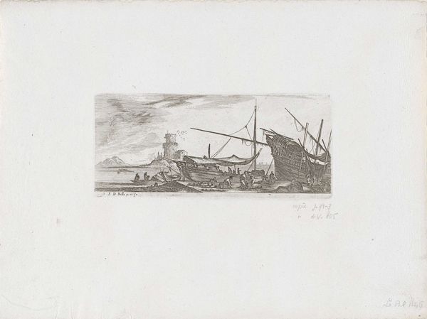 Joseph Hartogensis created "Weg langs een rivier," or "Road along a river," an etching, the date of which is unknown. The scene is dominated by a strong contrast of light and shadow, establishing a visual rhythm. The eye is drawn along the river’s edge, guided by the repetition of vertical elements—the masts of the boats, the post in the river, and the windmill in the distance. These create a structural framework that divides the composition into distinct spatial zones. The intricate network of lines, which vary in thickness and density, construct form and texture. See how the artist uses cross-hatching to build tonal depth. Hartogensis seems to be investigating the semiotics of landscape, using it to explore how we perceive and construct our surroundings. Consider how the artist has employed line, light, and shadow to articulate space and evoke a sense of depth. It's a study of how the formal elements work together to shape our understanding and emotional response.