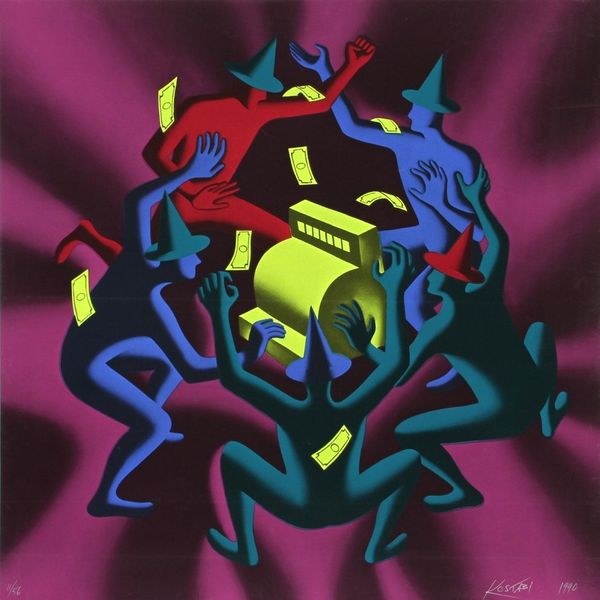 Editor: Mark Kostabi’s "The Embrace," painted in 1990 using acrylic, strikes me as intensely lonely, despite the image of two figures in a close embrace. It's as if they are desperately clinging to each other in the void. What symbols do you find particularly resonant in this painting? Curator: The facelessness is crucial. By stripping away individual identities, Kostabi invites us to project ourselves, our relationships, our fears, and our desires onto these figures. Don’t you feel a kind of existential hollowness emanating from that anonymity, reminiscent of mannequins or even automatons? Editor: I see what you mean. It’s unsettling. The figures are intimate, but strangely impersonal. The stark palette also adds to that feeling. Curator: Precisely. Red, black, and white are colors pregnant with symbolic meaning across cultures. Here, the red, suggestive of passion and vitality, is sharply contrasted with the black of oblivion, creating a visual tension. Is the embrace an act of love or desperation against that darkness? What kind of solace can faceless forms offer one another, or ourselves? Editor: That’s a good question. The symbol of embrace becomes so much more complex when you consider the color choices and the figures’ lack of identity. Curator: And in that complexity lies the painting's enduring power. We continue to grapple with those questions of identity and connection within ever-shifting cultural landscapes. It prompts us to consider how our own cultural memories shape our perceptions of these fundamental human experiences. Editor: It’s amazing how much can be read into seemingly simple imagery when considering the symbolism behind each decision. Thanks for your insights.