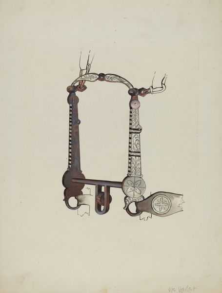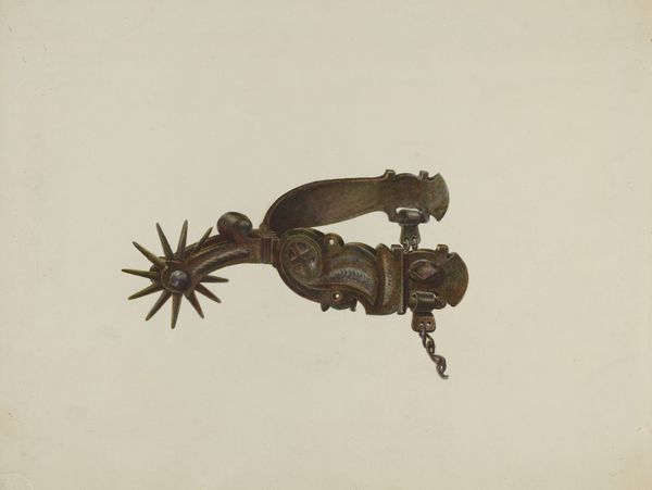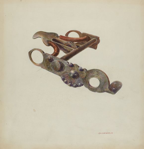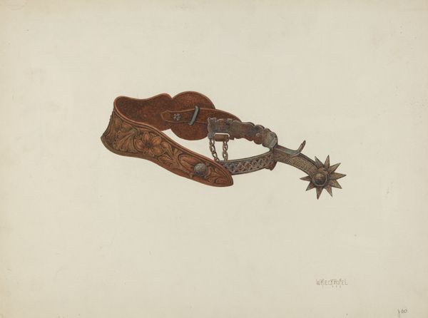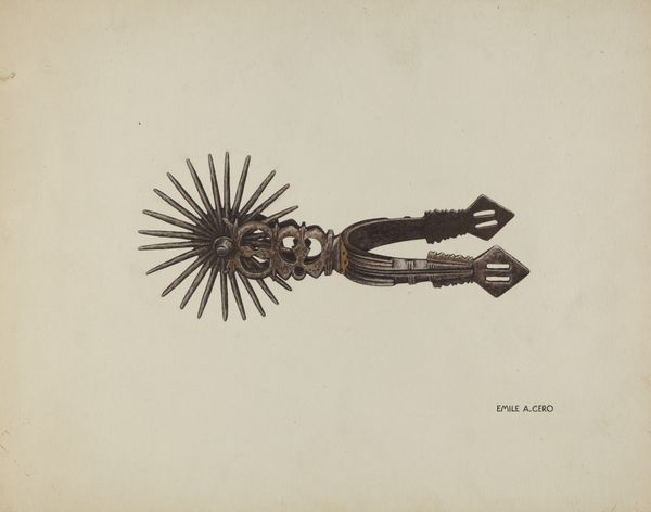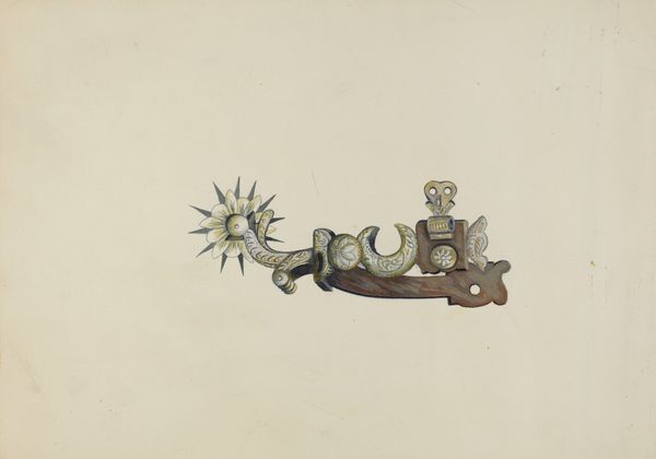 This is Ann Gene Buckley's watercolor and graphite rendering of a spur. While the exact date is unknown, we know Buckley was active in the late 19th and early 20th centuries. Buckley's detailed illustration offers a glimpse into the material culture of the American West. Spurs were not merely functional tools, they also held social meaning. The intricate designs and embellishments, carefully depicted here, signified status and skill within the cowboy culture. Buckley was an artist working for the US government. During this time, the government was eager to catalogue native arts and crafts. Buckley, along with many other women artists, found employment in the museum documenting a rapidly changing world. To fully understand this image, we can delve into archives of Western material culture, study the history of government-sponsored art programs, and consult historical accounts of cowboy life. This piece encourages us to consider the social conditions that shaped artistic production and the ways in which art reflects and reinforces cultural values.