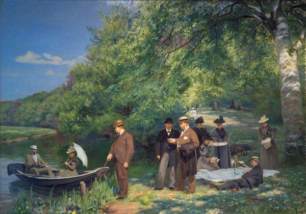 Editor: This is Pekka Halonen's "Hour of Rest," painted in 1905. It’s an oil painting and gives me a feeling of quiet, shared amongst the figures depicted. What draws your attention in this piece? Curator: Immediately, I notice the grouping, almost a sacred gathering in the woods. Halonen utilizes very specific symbolism of the figures arranged, and their relationship with nature itself. The composition calls to mind images of respite throughout centuries of depictions of laborers and harvesters. Notice how one figure holds a pipe; a connection to earth and to home. Editor: That’s interesting. I was focused on how tired some of the people looked, but your mention of sacred gatherings in nature shifts how I understand their rest. Curator: Yes, exactly. Observe how the darker clothing suggests a tie to labor. And yet, there's an element of contemplation; see the soft dappled light, seemingly inviting these figures to pause. Does it conjure anything for you personally? Editor: It reminds me of breaks my grandfather would take when working outside – those were sacred times to him. Times for thinking. It makes me wonder, do you think Halonen intended the title to be a bit ironic? Given all the symbolic weight, “rest” seems… simple. Curator: Perhaps, or perhaps Halonen is reminding us that within the simplicity of a moment of pause, potent symbols reside. Editor: This has given me a lot to consider about how everyday moments can hold such profound significance! Thank you! Curator: It was a pleasure; now I, too, will pause to reflect!