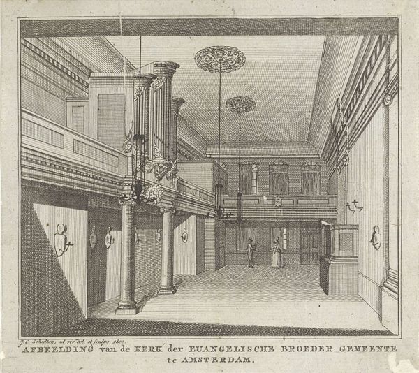 Curator: Ah, look at this serene scene. This engraving, created by Daniël (I) Veelwaard in 1794, offers us a peek inside the Doopsgezinde Kerk Bij 't Lam in Amsterdam. Editor: It’s striking, isn't it? Immediately, I feel the coolness, almost a solemn chill, despite the light flooding in from those windows. The precision of the lines gives it such a stark beauty. Curator: Absolutely. What's fascinating is how Veelwaard captures the architectural principles of the time, that leaning towards neoclassicism... emphasizing balance and order even within this religious space. Notice the strong verticals, the symmetrical organization of the balconies... Editor: You're right. It feels designed for a very specific kind of public life, one of contemplation, of course, but also social structure. Those meticulously rendered figures give us just a hint of the church's community and those stark dark plaques hint at a strong message from scripture and social duty. This isn’t just about personal reflection, but collective identity, wouldn't you say? Curator: Precisely. And in this historical moment, thinking about the role of the church and its visual presence in Amsterdam is crucial. These images become ways of communicating the values and authority of the institution... A sort of social architecture captured with the utmost detail. Editor: But despite its detail and precision, there's a dreamlike quality to it. That soft light washing across the scene softens its geometry. It’s like peering into a memory or imagining a space of both order and tranquility, maybe an escape even? Curator: I love that perspective. It resonates with how religious spaces often function. The architecture itself shapes and guides one's emotional experience and, therefore, how one may act within those walls. Editor: Well, looking at it has shifted something in me! The cold detachment is receding, I think there's still beauty, I see warmth in those lines after all. Curator: Me too, it has been enlightening and a pleasure to consider Veelwaard’s perspective together.