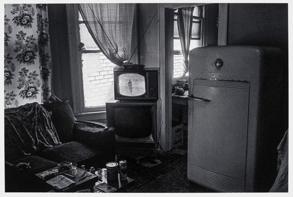 Curator: This is Dennis Feldman's "TV (Mr. Whipple) – Boston, MA – 1973," a photograph capturing a moment in what seems to be someone’s living space. The dimensions are roughly 8 1/2 by 11 inches. Editor: My first thought? It feels...stuck. All that stillness, even the fan seems frozen. Curator: Given the title, it's referencing Mr. Whipple from the Charmin toilet paper commercials. He represents consumerism and controlled messages in the media. Editor: Oh, absolutely. It is a comment on media saturation! The cluttered space—the newspapers, the books—compete with the TV itself. It's sensory overload! Curator: Exactly. The composition positions the television as a focal point, subtly critiquing its influence on domestic life and culture. Editor: There's something so melancholy about it too, though. It feels like time is just passing, in this quiet space. Curator: Right. Feldman's work encourages us to consider how we consume information and how it shapes our understanding. Editor: It really does. It prompts a reflection on the quieter forms of control in our daily existence.