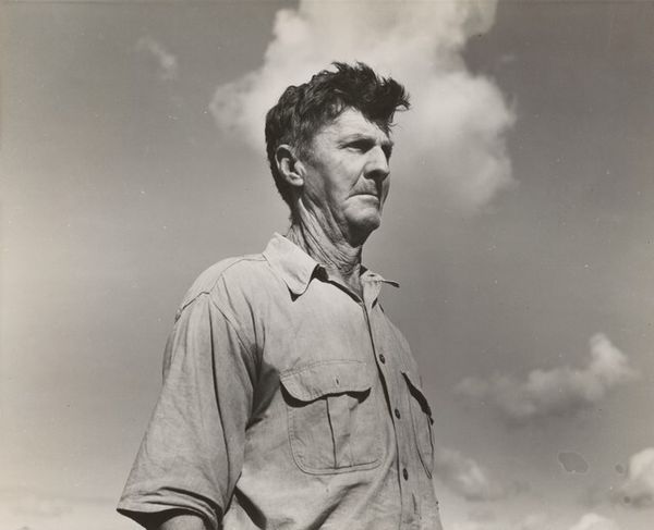 Editor: This captivating black and white photograph, "South Lebanon, 1952," by Akram Zaatari, features a man standing against a wooden wall. I’m curious about the interplay between the subject and the backdrop; how do you interpret this work? Curator: Note how the composition, primarily vertical lines, creates a sense of formal rigidity. The subject's pose mirrors this, yet the subtle imperfections in the wood grain and the faded inscriptions soften the overall structure. What does this tension suggest to you? Editor: Perhaps a dialogue between stability and impermanence, control and freedom? The man's gaze is so direct. Curator: Precisely. The photographer manipulates the tonality to emphasize the textures and patterns, prompting us to consider surface and depth, presence and absence. It's a testament to the power of photographic formalism. Editor: I see it now. Thank you for highlighting the visual language at play. Curator: Indeed. Analyzing these elements provides a deeper understanding of the photograph's inherent qualities.