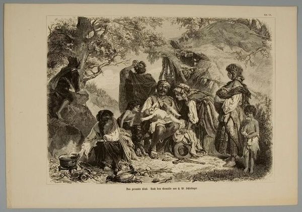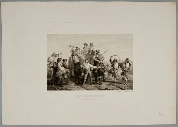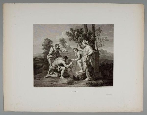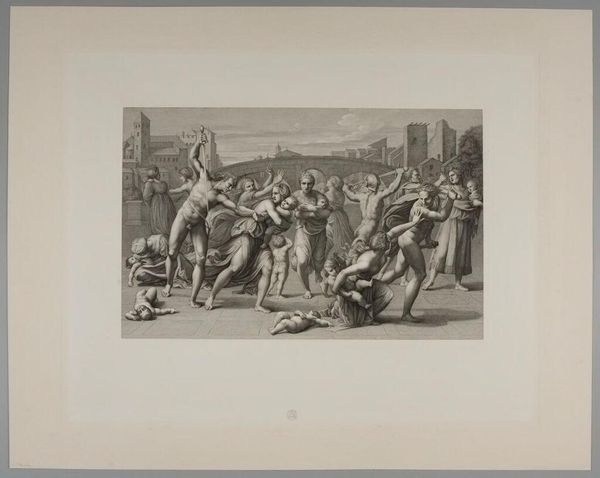 Curator: Angelo Emilio Lapi's "Saint John Baptizing the People" presents a fascinating study in line and form. The dimensions are roughly 36.5 by 53 centimeters. Editor: Yes, the first impression is of a carefully constructed composition, almost staged in its arrangement of figures. The ritual is front and center, of course. Curator: Note the careful balance. See how Lapi uses contrasting light and shadow to define the figures and create depth. The materiality of the plate enhances this effect. Editor: The symbolism of water as purification is powerful here. The bare bodies signify vulnerability, the group in the background hints at community. Curator: Precisely. The artist masterfully uses linear perspective to create a sense of space and atmosphere, drawing the viewer's eye deeper into the scene. Editor: It's also interesting how the image builds on earlier artistic tropes while the figures themselves gesture to a timeless ideal of spirituality. Curator: Indeed. It invites reflection on the nature of grace, the structure of faith and its visual representation. Editor: It’s a reminder of how sacred moments are both personal and communal, filtered through visual language.