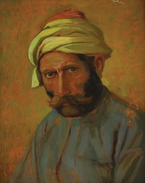 Curator: Looking at this portrait, I'm immediately struck by the subject’s gaze; there's an intense directness there, wouldn't you agree? The colors, though muted, lend the piece a very imposing presence. Editor: I'd say that the direct gaze evokes a sense of pride, or perhaps defiance, particularly considering the history of how Black men were often depicted – or rather, not depicted – in art. This work, titled "Black Man" and attributed to Konstantinos Maleas, immediately raises questions about representation and power dynamics. Curator: Precisely. Now, let’s think about the style. It's identified as Realism and even Orientalism, but to what extent do labels truly encapsulate the essence of the piece? Does it offer a true reflection of the subject, or does it subtly engage with colonial perspectives? Editor: Absolutely. The layering of labels complicates our understanding. Considering Orientalism, how does this image partake in or resist the visual tropes associated with the "Orient"? Does it reinforce stereotypes or challenge them? Curator: It seems to tread a fine line, perhaps unconsciously so. The subject's turban and clothing nod to Orientalist themes, yet there's a grounded realism in the man’s face, an undeniable humanity that transcends simplistic categorizations. Editor: Exactly. The absence of a specified date further complicates our ability to fully historicize and situate this painting. Without it, the socio-political reading becomes all the more critical. Who was this man? What was his story? How would the viewers at the time have read this representation, compared to a modern, more conscious viewing? Curator: The social context of both the painting's creation and its reception heavily informs its impact and the meaning we ascribe to it today. As an image in the 21st century, how do its textures interact with current visual tropes around identity and representation? Editor: It brings to the surface questions we're still grappling with – who gets to control the narrative, how are marginalized people visualized, and how do we avoid perpetuating historical biases? A portrait such as this challenges us to look critically at our own assumptions and the power structures that inform them. Curator: Indeed. And I believe that dialogue – that persistent questioning – is crucial for extracting richer understandings and a more informed vision for art's future roles in society. Editor: Yes, a potent image, stimulating conversation and continued critical engagement.