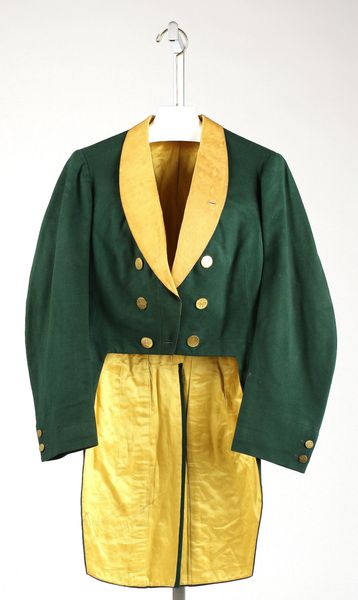 This formal ensemble, crafted by Mathew Rock, presents a study in sartorial geometry and restrained elegance. Dominating the visual field is a long coat in a dark hue, its lines sharp and defined, creating a strong vertical emphasis. The ensemble's composition adheres to a clear structure, with each element contributing to an overall impression of order and deliberate construction. The eye is drawn to the interplay of contrasting textures: the matte finish of the coat's main fabric against the lustrous lapels, which adds a tactile dimension to the visual experience. This contrast destabilizes the monochrome palette, subtly enlivening the composition. The buttons function as visual anchors, their placement precise and purposeful, reinforcing the symmetry inherent in the design. Through its form, this ensemble transcends mere functionality, becoming a statement about societal norms. It invites us to consider how clothing can be both a personal expression and a reflection of broader cultural codes. The dark hue, coupled with the rigid lines, hints at the power dynamics embedded within formal attire, even as it offers a study in understated beauty.