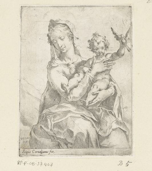 Bartolomeo Biscaino’s delicate line drawing, "Christuskind met vat op wolk", presents a tender scene rendered with precise detail. An oval frame encrusted with foliage contains a cherubic Christ Child reclining on a cloud, seemingly at rest upon a globe. The composition invites contemplation on the relationship between innocence, power, and the divine mandate over earthly dominion. Biscaino masterfully uses the graphic medium to delineate textures, from the soft billows of the cloud to the robust form of the child. The radiating lines emanating from the infant suggest a divine aura, while the circular composition of the wreath binds the iconography. The globe, rendered with understated precision, could symbolize the world under the aegis of spiritual guidance. Such semiotic encoding reflects the Baroque era’s preoccupation with themes of salvation, authority, and the intertwined destinies of heaven and earth. What does this say about the values of the period?