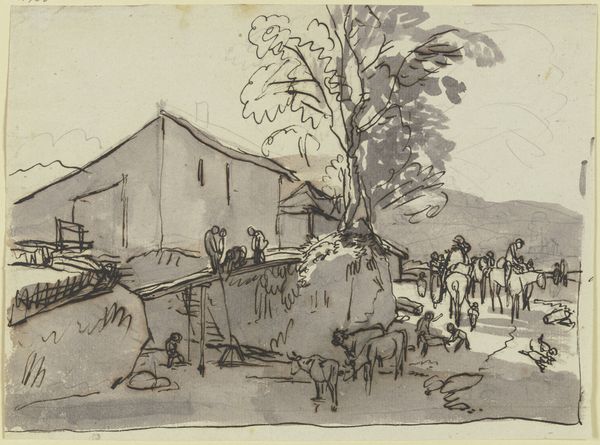 Curator: Here we have a print titled "Twilight Rain in Red Square." While its creator remains anonymous, its impressionistic style captures a familiar scene in an entirely novel manner. Editor: Ah, yes. It feels… heavy. Dense, somehow. Like the air before a storm, but melancholic rather than charged. All those figures swallowed by the rain... Curator: Indeed. The choice to render this cityscape—Red Square, a potent symbol of Russian identity and power—through the lens of rain creates a compelling contrast. One might argue that the obscured details critique notions of monolithic power structures. The figures almost merge together. Editor: I feel that. It makes me think about how collective memory is also like rain – constant, pervasive, and yet also capable of eroding even the grandest structures over time, until what's left is… this. This quiet moment of reflection, maybe. What do you think? Curator: I think that speaks volumes to the power of landscape as a vehicle for social commentary. What might have initially been viewed as a simple cityscape takes on further dimensions. Editor: Right? And beyond that, the use of the printmaking process itself adds another layer. Reproducible, accessible... it almost democratizes the experience of seeing this symbolic space. Like bringing the revolution to everyone's fingertips, one rainy impression at a time. That's cool! Curator: Absolutely. By utilizing a more accessible medium, the artist engages with a broader public, thereby disrupting traditional hierarchies within the art world and, perhaps, challenging the socio-political status quo. Editor: The longer I look at this, the more the blur and greyscale tone creates a stage of anonymity that unites the group of individuals populating Red Square... Even though they aren't together in any apparent formal gathering or demonstration, the conditions suggest that they have at least this moment of shared experience in common. I'll never look at a rainy city the same way again. Curator: Precisely. Thank you for bringing a more sensitive view of our shared experiences into this moment with "Twilight Rain in Red Square."