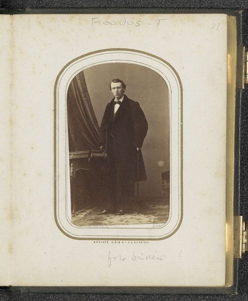This photographic portrait of a man with a top hat was made by Frederik Kayser, a 19th-century Dutch photographer. The carte-de-visite, as this format was known, was made using the wet collodion process, a labor-intensive technique where a glass plate is coated, sensitized, exposed, and developed, all within a short time frame. The resulting negative could then be used to make multiple prints on albumen paper, a process involving coating paper with egg white to create a glossy surface. The popularity of cartes-de-visite coincided with the rise of industrial capitalism, allowing for mass production and distribution of images. The format democratized portraiture, making it accessible to a wider segment of the population beyond the elite. The material and process reflect a shift towards reproducibility, mirroring the broader industrial transformations of the era. Ultimately, understanding the materials and making of this photograph sheds light on its cultural significance, and reminds us that even seemingly straightforward images are shaped by specific processes and social contexts.