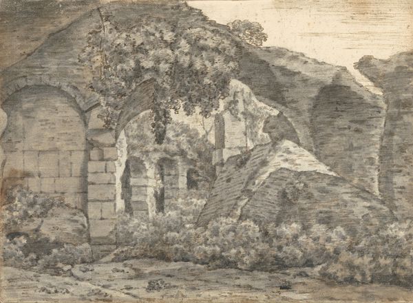 Editor: This is "Die Ruine Hubertuskapelle bei Bergen," a drawing by Anton Radl. It appears to be ink and gouache on paper. There’s such a sense of quiet melancholy in this ruinous landscape. What story do you see here? Curator: Radl captures a prevalent Romantic fascination with ruins. These crumbling structures weren't simply seen as decay, but as potent symbols of the past's grandeur and the transience of human endeavor. We see this fascination emerge at a particular point, don’t we, with shifts in social structures and the rise of nationalism. Does the inclusion of figures—the man and the goat—alter the mood for you? Editor: Yes, it’s interesting you point that out. They make it feel less remote. Like a staged performance, where you have remnants from the past as part of present cultural commentary. What was Radl commenting on? Curator: It's difficult to pinpoint a single definitive comment. Remember that the appreciation of ruins was also a political act. In a way these artists, by celebrating ruined abbeys, friaries or castles were expressing nostalgia for a certain form of order, implicitly expressing grievances against contemporary conditions. Editor: So, the choice of ruins was itself a political act embedded within the context of artistic creation and viewing. I hadn't thought of it that way, as a very pointed commentary of present issues with nostalgic imagery. Curator: Exactly! Consider where this work might have been displayed – perhaps a salon, perhaps a private collection. The audience, their social standing, their political leanings—all contribute to the reception of this ruin and its commentary. Editor: It's fascinating how a landscape drawing can contain so much historical and political context. Thanks for making that come to life. Curator: My pleasure. Looking at art through the lens of history reveals layers we might otherwise miss.