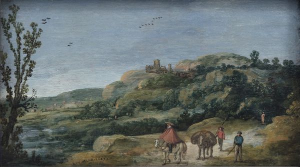 Curator: What strikes me about Anton Mirou's "Hunter and Horsemen on a Wooded Road, with a Village in a Valley beyond" from 1608, held at the Rijksmuseum, is how the everyday intersects with something almost mythic. Editor: My initial feeling is of tranquility, almost melancholic. The subdued palette and the receding landscape invite introspection, like peering into a dream. It’s quite a detailed oil-painting on wood. Curator: Absolutely. It embodies a sort of baroque spirit through its composition: see how he organizes it in these three planes to lead the viewer’s eye into the depth? In terms of cultural symbolism, it highlights a connection to the land that was deeply important in 17th century life in Europe. Hunters were important cultural figures and even archetypes within aristocratic societies. Editor: Yes, and the juxtaposition of the hunter figure – representing control, perhaps power – with the vast, somewhat indifferent landscape does pose questions about the social forces at play in that era. One must not forget how landscape painting gained traction in that particular historic context! Was it a mirror, or a mask for social order? Curator: That’s fascinating! The image could portray order, but I feel that a tension also resides within that controlled setting. The slight asymmetry, those darker shadowed areas on the right… The symbolism of a forest can speak to subconscious anxieties. It can denote both mystery and danger. It gives me some uncanny vibes. Editor: I concede the undercurrent of something disquieting. The figures almost seem dwarfed. But it reminds me that art served many purposes, including celebrating property and those who commissioned such work. Perhaps those hunters simply sought to see their activities immortalized on panel. The act of depiction lends status and legitimizes ways of life, including this activity! Curator: That's a great point, these are also visualizations of social values and systems. It certainly opens up possibilities of what the picture communicates or stands for beyond face value! Editor: Indeed. It leaves me thinking about what it means to represent "nature" in painting, the cultural work such representation does. Curator: I will now certainly consider it more deeply as I look at it again. Editor: A very profitable look, thank you.