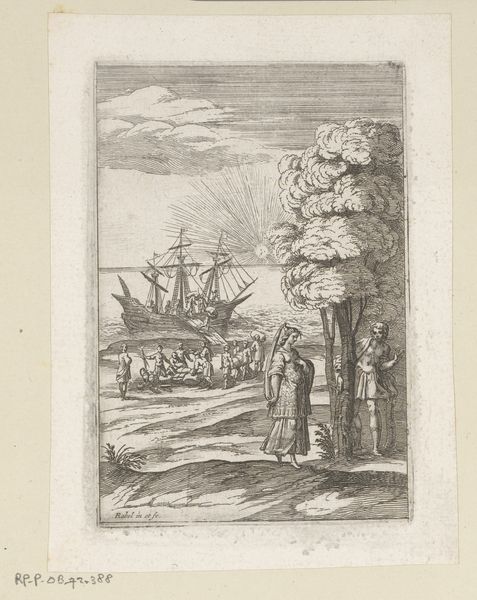 Curator: Daniel Rabel likely created this engraving, entitled "Zeegezicht met een eiland, schepen en een stad" which translates to "Seascape with an island, ships, and a city", sometime between 1588 and 1637. Editor: My first impression is drama; there’s a certain anxiety conveyed in the high waves, the leaning ship. It almost feels like a visual metaphor for the turbulent times, whatever they may have been! Curator: Indeed! Look closely at the engraver’s skill. See how he uses incredibly fine lines to build form and texture? You can practically feel the roughness of the sea and the way the sails billow in the wind. This wasn't just about capturing a scene; it's about the mastery over the material that creates such texture! Editor: And observe how Rabel incorporates elements of fantasy with more realistically depicted maritime elements, or the almost cartoonish plumes of smoke. Those ships on the horizon carry so much weight—ships appearing repeatedly in art from this period often stand as symbols of commerce, adventure, or perhaps something less tangible, like the human soul’s journey. Curator: Precisely! This reminds us how connected the prosperity of a region or even individual was at the time, deeply relying on international commerce and shipping. One printing plate could reproduce hundreds of these images. I wonder how this specific image informed or swayed viewers at the time. Was this for news, religious propagation, or perhaps more secular interest in travel and seeing faraway cities and scenes? Editor: Possibly all those things combined. Even a landscape or seascape becomes loaded with symbolism and aspiration, especially when representing foreign locales. That cluster of figures standing ashore – what does their presence signify in the grand narrative Rabel is spinning? Curator: A very good point! Consider what a process was required in production - drawing, etching, proofing - repeated actions where the intention could also subtly change! Editor: Examining the recurring symbolic language of seascapes allows a glimpse into past cultural values; here, that dialogue includes notions of faith, discovery, and human vulnerability when at the whim of nature’s power. Thank you for bringing forward these points today! Curator: Thank you for this intriguing outlook. The work now brings to the front new meanings.