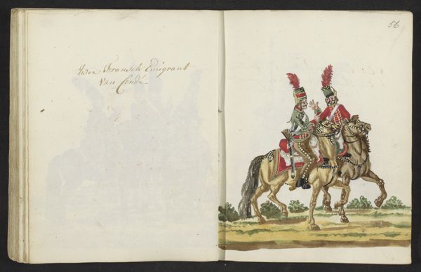 Curator: This is a page from a sketchbook depicting an English Hussar uniform, rendered in ink and coloured pencil, sometime around 1795. It’s attributed to S.G. Casten. Editor: It's striking how vividly the red of the uniform pops. There's a real sense of flamboyance and confidence. The slightly cartoonish style of the drawing contrasts strangely with the very serious implications of the subject matter, doesn’t it? Curator: It does. These genre paintings, even in sketchbook form, often served as both documentation and, more importantly, as subtle forms of political messaging. Depictions of military prowess contributed to the broader nationalist fervor that was sweeping Europe at the time. Think about the way uniforms become visual shorthand for power. Editor: Exactly. And how the details signify status. This isn't just a generic soldier. Consider the time in which this image was created. Who was it intended for, and what sort of politics does the artwork convey? Was this a display of national pride or perhaps a statement related to the social position of the military in that time? Curator: Well, the meticulous detail suggests an intended audience familiar with military uniforms and their associated symbolism, likely within court or military circles. Given the historical context, the uniform may also represent shifting power dynamics, colonial aspirations, and gender expectations. Think about what "masculinity" looked like on the world stage in the late 1790s! Editor: The almost obsessive level of detail does indicate something beyond simple observation. I wonder how such images impacted contemporary perceptions of military authority. Did the romance of such paintings conceal the often brutal realities of war? Curator: No doubt it's about power, yes. But also pageantry. And these were potent tools. The colours, the posture…the whole ensemble is designed to project authority. Think of it as an early form of state propaganda, carefully managed visual rhetoric influencing public opinion through controlled narratives. Editor: Indeed. A visual spectacle meant to inspire awe and loyalty. Seeing it now, separated from its immediate historical purpose, it's interesting how readily that visual language of authority remains legible. Curator: It reminds us of how carefully constructed such images were—and are—in shaping our understanding of conflict, heroism, and even what it means to belong to a nation. Editor: Yes, it serves as a poignant reminder that visual culture is inherently intertwined with social and political power structures. The sketchbook context provides intimate insights.