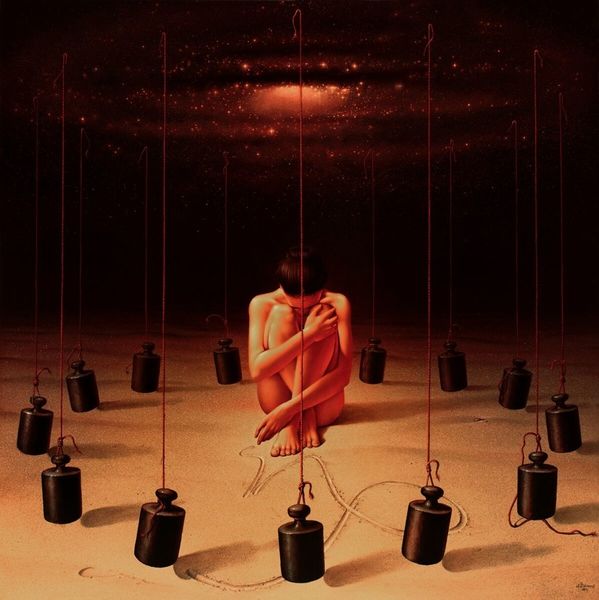 Editor: This is "La Lyra" by Siegfried Zademack, painted in 2017 using acrylics. It’s quite unsettling. All these figures draped in white, each holding a lit candle, stretching into the distance…what strikes you when you look at it? Curator: The figures' anonymity is fascinating. Their shrouds negate individuality, transforming them into manufactured units. What materials are in play beyond the acrylic on canvas, and what societal implications might they reveal? The ropes, the candles, even the ground they stand on, imply a labor, a manufacturing, that transcends mere artistry. How does the commodification of ritual contribute to the social order? Editor: So, you're saying it's less about the spiritual aspect of the candles and more about the process, almost like an assembly line of…what exactly? Are these ghost-like beings mass produced? Curator: Precisely! We're encouraged to consider production, the social hierarchy. The "fantasy" is constructed using tangible materials. Look at the ropes that bind some of the figures – they limit movement, enforce uniformity. We have to ask what system is making use of this group labor. Editor: It's interesting you highlight the material aspect. The robes appear like the figures are swathed in textile. Their connection to a specific industry. What are they making or being used for, who gains what? Is it then a statement on exploitation? Curator: Could it be read as a comment on modern manufacturing and alienation of labor? The materials of these "ghosts," robes, rope and the candle wax, hint at the broader cycles of creation and the people involved, seen and unseen. Does knowing it was painted recently alter your read of older practices being alluded to? Editor: It definitely adds another layer. It prompts a conversation about continued exploitation that echoes into the present day. Curator: I agree. Understanding the social implications embedded in even fantastical artistic creations can enrich our understanding and, I think, hopefully question it. Editor: I hadn’t really thought about approaching art from that angle. That helps me think differently! Thanks.