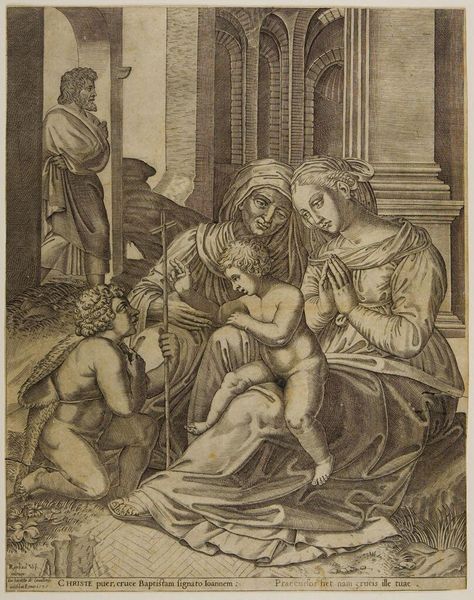 Curator: Wow, this print just exudes...history! It feels like peeking into a dream, a very formally arranged dream, I'll grant you. Editor: We’re looking at Agostino Carracci's "The Holy Family with Sts. Anthony Abbot, Catherine and the Infant St. John," from 1582. Observe how Carracci uses a complex interplay of light and shadow, typical of Mannerist engravings. Curator: Mannerist...yes, I see that. The elongation of the figures, especially Catherine, adds to this feeling of… not quite rightness. I am instantly drawn to that wild boar. Isn't that strange? All these saintly figures and then, BAM, wild pig! It disrupts the harmony somehow, challenges the…sanctity. Editor: Ah, yes, the boar is intriguing. Structurally, it anchors the lower register, providing a dark, contrasting mass to balance the lightness above. The figures are carefully arranged along implied diagonals, drawing the eye upward from Catherine and the boar towards the Virgin and Child. Notice also the classical architectural backdrop—pillars, entablatures, creating depth through linear perspective. Curator: Linear perspective is indeed cleverly used... But back to my boar, is he some kind of symbol? Goodness trying to triumph over something…darker? Anthony Abbot is traditionally linked with that symbol; wildness tamed, or at least kept at bay. Maybe Carracci is saying holiness isn't always serene; it's a battle? Editor: Semiotically, we can interpret it as the triumph over earthly desires. Carracci layers different modes of representation here: the realism of the boar versus the idealized figures. He presents them using precise hatching and cross-hatching to modulate tonal values, making it an impressive work considering the limitations of engraving at that time. Curator: It’s like these saintly folks, while beautiful and composed, exist atop something earthier, wilder. And that’s, strangely comforting! Perhaps we need those reminders of the animal within, you know? Thanks Agostino, it is really a journey with unexpected little bumps! Editor: Indeed. Through carefully orchestrated visual elements, the artist conveys the tension between the spiritual and the corporeal, reflecting the artistic currents of his time. It’s been enlightening to examine this piece together.