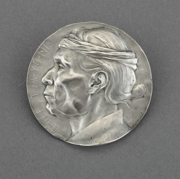 Editor: This piece, crafted in 1904 by Edward Warren Sawyer, is a striking silver medal titled "Ne-I-So-Meh—Yuma." The profile is incredibly detailed, especially the hair. What stands out to you about this work? Curator: I'm drawn to how this piece intersects with the history of representing Indigenous people. During the early 20th century, there was a fascination, often fueled by a romantic, yet problematic lens, with documenting Native American cultures, frequently on the verge of being eradicated. The medal format elevates the subject, but what context surrounds its creation and intended audience? Editor: So, was this piece commissioned for public display or private collection, shaping its cultural role? Curator: Precisely. Consider the socio-political climate. This was an era of forced assimilation and the suppression of Native cultures. How does Sawyer's depiction reinforce or challenge these dominant narratives? The choice of silver, often associated with wealth and value, also merits consideration. Does it honor the subject, or subtly reinforce existing power structures? Editor: I see your point about the silver; the representation might still be viewed through a colonial lens even with an attempt to memorialize. What should viewers consider when reflecting on this medal? Curator: Think about the act of memorialization itself. Who gets remembered and how? "Ne-I-So-Meh—Yuma" offers an opportunity to reflect on the complex history of representation, power dynamics, and the ongoing need for diverse voices in the telling of cultural stories. Editor: It’s much more complicated than just a pretty profile! Curator: Indeed. Art can be a powerful tool for understanding our past and informing our present. Considering these issues allows for a more enriched experience and appreciation of the work. Editor: Thanks, that’s given me a lot to consider about how we represent and remember.