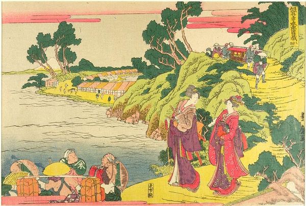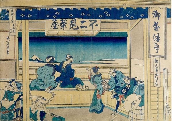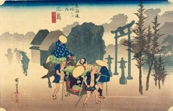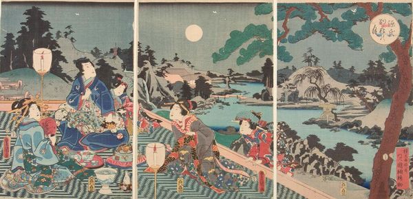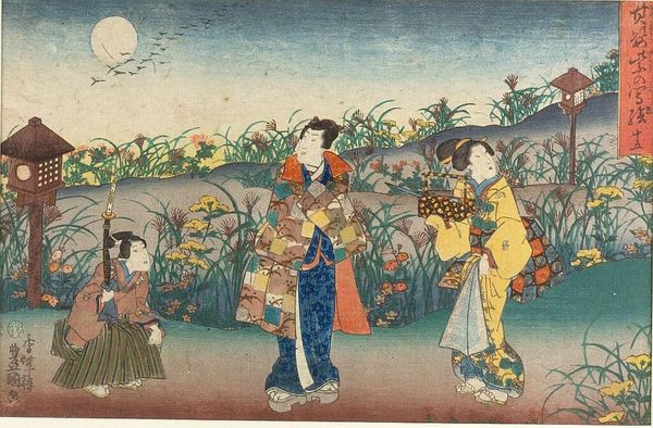 Curator: This is Utagawa Kuniyoshi's "Shin-Yoshiwara," from the series Famous Places of the Eastern Capital. I am immediately struck by the scale of the moon relative to the figures below. Editor: Yes, it's quite evocative. The texture, the woodblock print process, almost feels like fabric. The figures appear to be engaged in labor and leisure. Curator: Absolutely. The Yoshiwara district was a significant site, a pleasure district with complex social dynamics. Consider the figures; they are positioned as both observers of and participants in this carefully constructed world. Editor: Let's not forget the materials themselves. Woodblock printing allowed for mass production and dissemination, impacting the consumption and accessibility of art for a broader audience. Curator: Precisely. The print invites us to consider the intersection of class, gender, and the performative aspects of urban life in Edo-era Japan. Editor: It's the marriage of the printmaking process with the human figures that really brings it alive for me. Curator: Indeed, and examining that connection gives us a deeper look into the social complexities of the time.