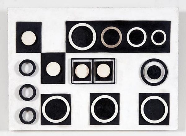 Editor: This is "Cercle rouge et noir" by Antonio Asis, created in 1980 using acrylic paint. The nine circles arranged on the canvas create such a stark, almost clinical feel. The colors, just black, red, and white, contribute to this sterile atmosphere. What do you see in this piece? Curator: The clinical feel, as you put it, is very interesting. I see it less as sterile and more as a kind of visual code. Circles, throughout history, have represented wholeness, infinity, the cosmos. Red is often linked to passion, vitality, warning; black to the unknown, power, elegance. So, we have these loaded symbols presented in a grid. What does that juxtaposition suggest? Editor: A visual code...maybe it’s a set of instructions? A warning perhaps? The rigid format makes it seem intentional. Curator: Exactly. Think of road signs or diagrams. The simplicity invites interpretation, almost like a Rorschach test. The colors and shapes have deep roots in our collective consciousness, beyond just aesthetics. Is this purely abstract, or is Asis commenting on how we process visual information? What is this form communicating? Editor: So, it's not just about the pleasing geometric shapes; the artist is intentionally playing with symbols that evoke deeper feelings. Is the black and red an attempt at a disruptive, forceful symbol? Curator: Precisely. By presenting these fundamental symbols in such a clean, repetitive way, Asis forces us to confront their inherent power. The arrangement also calls attention to how easily a symbol or a code can lose all relation to meaning. Editor: That makes so much sense. I initially saw just shapes and colors, but it's really a system of cultural communication he is tapping into. Thanks for expanding my perception! Curator: My pleasure! It's rewarding to unpack the layers beneath seemingly simple forms. There is so much beyond just the first glance!