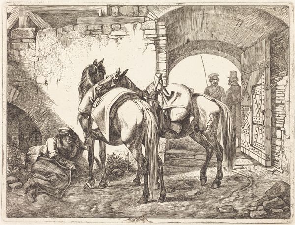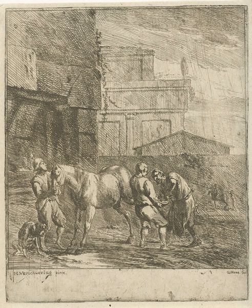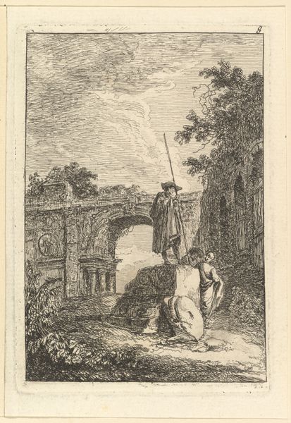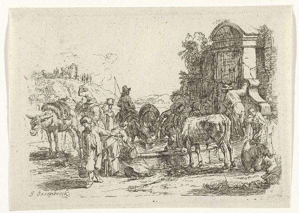 Editor: So, this is Rembrandt van Rijn's "The Good Samaritan" from 1633, an etching. It's a pretty busy scene with lots of figures. It’s an intricate work, quite detailed despite its relatively small size. What are your thoughts on this work? Curator: Well, first consider that Rembrandt was not just illustrating a biblical story but also participating in a broader print market. The very act of creating this image as a readily reproducible etching points to its intended consumption by a wider audience beyond the wealthy elite. The labor involved in etching—the physical act of incising the design onto a metal plate, the selection of materials, the printing process itself— these choices all impact the image. Editor: So you're saying the process itself gives the art meaning? Curator: Exactly! Think about the contrast between the delicate lines used to depict the landscape versus the heavier shading used to convey the figures’ emotions. Rembrandt's manipulation of the medium is telling us about the value of labor and materiality, even suggesting a link to the marketplace. Editor: I see. It almost challenges the preciousness associated with traditional painting, since etching made prints readily accessible to people outside the elite class. What is Rembrandt trying to achieve with this approach? Curator: Precisely. The distribution and accessibility, inherent in printmaking, democratized art. This makes you think about who his patrons were, and to what extent did they approve of the democratization that printmaking allows for? What tensions were apparent in the Dutch art market between catering to wealthy patrons and a middle-class market? Editor: It's fascinating to see artmaking not just as artistic creation, but also as a process embedded in economic and social dynamics. Curator: Indeed. Looking closely at Rembrandt’s process encourages us to consider his intended audience and his place in the cultural marketplace, changing how we value it today.