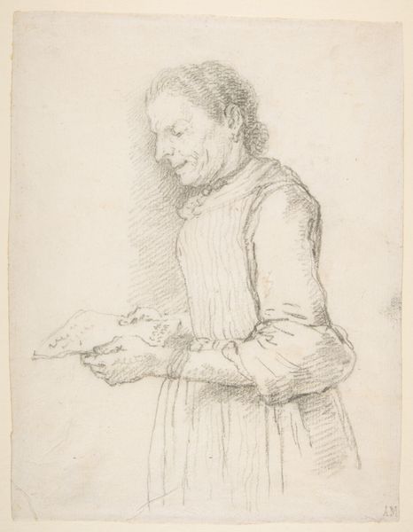This is Luigi Pellegrino Scaramuccia’s chalk drawing, "Portret van een lezende geestelijke," or, "Portrait of a Reading Cleric." Scaramuccia, born in Rome, spent his career painting in Bologna and other cities of northern Italy, a region central to the Catholic Church. Here, we see a cleric engrossed in his reading. His eyes are closed as his finger touches his face in contemplation. Although the details of his clothes are minimal, we can observe a certain softness in the rendering of the fabric. There's also a gentle quality in the cleric's face. As viewers, we are invited into a moment of interiority that transcends the cleric's official role. This intimate portrayal subtly complicates traditional representations of religious figures. The artist captures a sense of personal reflection, suggesting that even within the structure of religious life, there is space for individual thought.