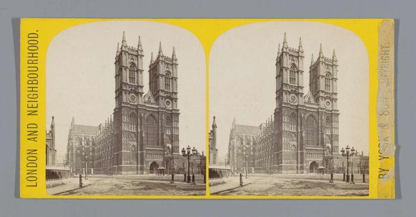 Curator: We’re now looking at Samuel E. Poulton’s "View of Westminster Abbey from Victoria Street, London," a gelatin silver print made sometime between 1870 and 1888. It is currently held here at the Rijksmuseum. Editor: The first thing that strikes me is the grand, almost theatrical perspective. The abbey dominates, of course, but the long street amplifies the scene, like a stage set leading up to this architectural crescendo. Curator: Yes, Poulton’s use of linear perspective creates a powerful visual hierarchy, doesn’t it? The photographic texture lends it a specific quality, almost ghostly. Note the contrast between the light stone and the shadows which define the structural grid. Editor: It also evokes a specific era. Imagine the London that produced both smog and high society, an industrial giant struggling with identity and rapid development during that time. We see evidence in this photograph. The empty streets seem…sanitized. Curator: The composition, though, guides our gaze upwards, past the grittiness. The careful tonal arrangement makes us see it formally, divorced from history to some extent. The placement of the towers, almost mirrored… Editor: Perhaps, but context is crucial. The late 19th century was obsessed with documenting progress. Photography served a vital social purpose—evidence. Consider the politics embedded here: a celebration of institutional power viewed through a very controlled, even exclusionary lens. Few common people are shown. Curator: But that controlled composition underscores a careful orchestration of light and shadow. Semiotically, we can examine the formal repetitions of shape, the subtle variations… It suggests a stability in the structures that goes beyond history. The towers represent time. Editor: Fair enough, and maybe there's something more here than urban boosterism, but seeing Westminster Abbey then, almost devoid of human life beyond distant figures, invites us to question who was empowered to depict such iconic landmarks in that way. And what stories got left out of the frame. Curator: Your point is well taken, there is an undeniable social component, yet Poulton was first exploring what a silver print can communicate by itself, aesthetically, almost removed from everything we understand by it socially and culturally. Editor: Ultimately, this work presents us with a striking duality, revealing and obscuring information to inspire consideration of how the past truly looks.