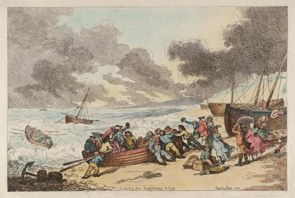 Here is a print by Thomas Rowlandson, satirizing the evacuation of civilians by the Royal Navy. Note the women waving their handkerchiefs, a gesture laden with centuries of shifting significance. The waving of handkerchiefs in farewell is not new, but its emotional texture shifts across time. We see echoes in ancient Roman funerary rites, where mourners waved cloths, not in greeting, but in a poignant farewell to the departing soul. The collective memory of loss and departure subtly infuses the seemingly innocent gesture here. Rowlandson's print, vibrant as it is, is tinged with a nervous anticipation, a collective anxiety masked by revelry, subtly revealing the psychological undercurrents of displacement and uncertainty. This seemingly simple gesture of waving connects us across time, a potent symbol of our shared human experience of departure and the complex emotions it evokes.
