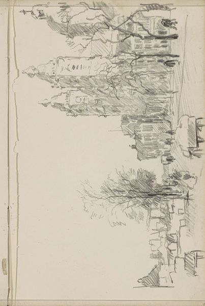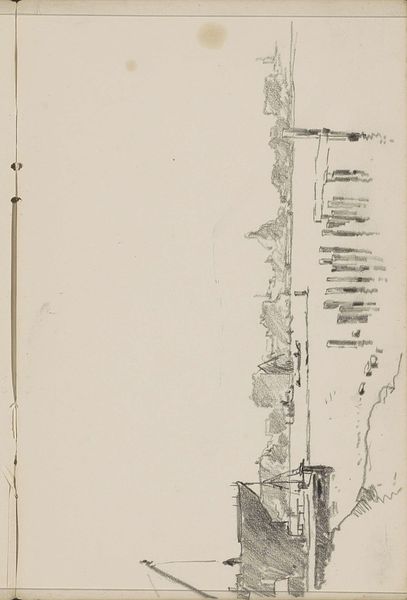 Curator: Welcome. We're standing before Cornelis Vreedenburgh's "Havengezicht," dating roughly from 1890 to 1946, a pencil drawing currently held here at the Rijksmuseum. Editor: It's fascinating! Raw, almost like a fleeting thought captured on paper. The starkness of the pencil against the empty space… it feels like a place waiting to happen. Curator: Vreedenburgh was known for his cityscapes and landscapes, and this piece is no exception. One could argue that this drawing's lack of completion might symbolize that. However, his dedication to depicting cities demonstrates that city spaces were becoming social stages with new dynamics between work and leisure. Editor: I am mostly looking at his medium, it's essentially lines upon lines; almost violently constructed by these obsessive mark-makings on the paper to generate an urban-materiality that feels incredibly contemporary even though it could be easily dismissed as something sketched in haste on paper. Curator: Indeed, but it could suggest the burgeoning industrialization of harbor cities at the time. Artists like Vreedenburgh were actively documenting these changing landscapes. And they engaged with the rise of urban culture and its influences. Editor: Precisely, you feel the grit, the implied clamor and bustle. The work almost vibrates with energy despite its quiet, understated presentation, where boats appear weightless along a fluid sea. Curator: Right. So we witness not just an industrial revolution, but the shift of cities and people within them through an urban evolution with pencil on paper. Editor: For me, it underscores the raw labor that constitutes such transformations, focusing on how something as fundamental as the harbor shaped individual lives. Thanks, it’s always good to focus on art processes as part of art evaluation. Curator: Agreed, and to examine these landscapes as reflections of their rapidly changing societal contexts, thanks!