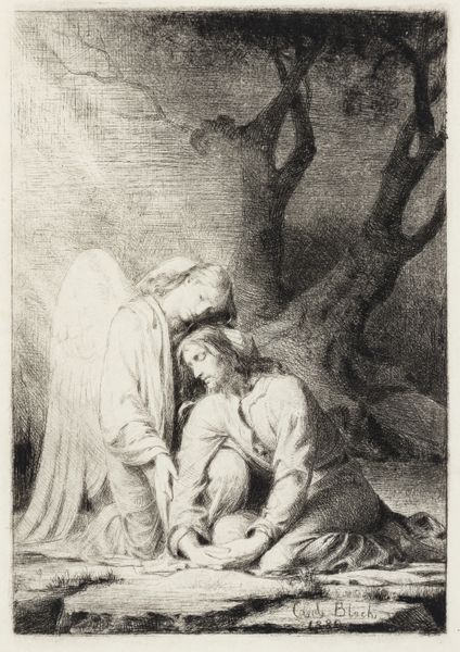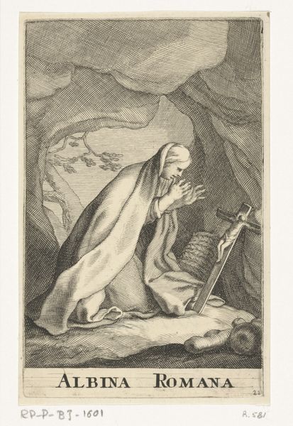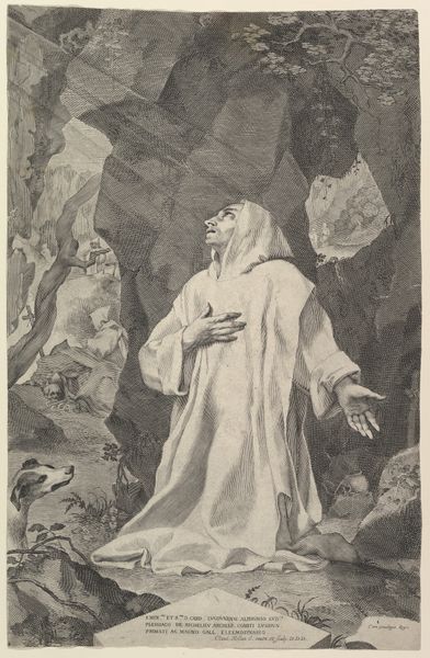 Editor: Here we have an intriguing work, "Man Praying in Wilderness," created by Nicolas Poussin, likely as a drawing, though its exact date is unknown. I am immediately drawn to the visible charcoal and ink strokes; the medium speaks volumes to me. What can you tell me about this work? Curator: Notice the paper's texture, a visible element in the overall composition. What was the purpose of a drawing like this, given the materials at hand? Was it a study, a preparation for a larger work? Consider the cost and availability of materials in Poussin's time. Who was buying art? Who had access to pigments? And how might this influence the choices an artist makes regarding scale, the use of labor-intensive processes or simpler ones? Editor: That makes me wonder about Poussin’s studio. Was this a solo creation or a workshop production? Did he personally grind the charcoal, mix the ink, or would assistants have handled some of those tasks? Curator: Exactly! Think about the division of labor, the hierarchies within the artistic workshop. It's also essential to remember that Poussin’s landscapes often reflect an idealized, classical vision, filtered through his understanding and manipulation of the available materials. Even the 'wildness' depicted here is carefully constructed using charcoal and ink. This wasn’t just any paper he found. This paper served a purpose. Editor: I hadn’t considered that this “wilderness” is actually the result of calculated and manipulated material processes! The availability and cost factors really shifted my perspective on the meaning of this drawing. Curator: Precisely. It moves our appreciation away from simple aesthetic enjoyment toward a deeper engagement with art’s history as a production and economic force. Hopefully, thinking materially helps unpack our assumptions about even what counts as nature itself.