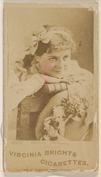 Curator: What strikes you first about this rather aged photograph? Editor: Warmth, definitely warmth. There's an embracing, welcoming quality about the woman's open smile. Curator: Indeed. This comes from the Actors and Actresses series, specifically N45, Type 4, produced between 1885 and 1891 by Allen & Ginter for Virginia Brights Cigarettes. Editor: Oh, so it's an advertisement, and a cultural artifact, too. Did they include one of these with each pack? What an interesting cross-section of portraiture, commercialism, and entertainment. I wonder what subconscious message these actresses sent by endorsing a product like tobacco, whether luxury or health hazard is debatable even now. Curator: Precisely! This small print offers a glimpse into late 19th-century social dynamics. Photography, drawings, and prints were commonly integrated in cigarette cards. Notice how the "portrait" aesthetic creates a sense of respectability, subtly connecting that aura to the brand. This also made the image instantly recognizable. Editor: Right, I imagine this was calculated. The actress here is smiling but wearing quite modest adornments: a furry, probably woolen bonnet, small brooch, drop earrings, and no showy display of wealth. Would you read into that at all? Curator: It depends how recognizable she was; I would suppose many card-holders wouldn't recognize her from the theatre anyway. Either way, in choosing her for such an intimate portrait, perhaps Virginia Brights wanted to signal to the smoking consumer the aspirational goals one could reach through that leisure. Her pleasant but seemingly average appearance would have helped connect with the average smoker. The brand also made many different actresses so their portrait would never grow too tired or cliché. Editor: That's really thought provoking: not relying on fame but implying attainability. These "Virginia Brights Cigarettes" would elevate the everyday. Fascinating to consider all that's packed into one little image. Curator: I agree, there's much to unpack. Editor: The material reality of this one artifact helps us see a past full of complexity that, however strange, can connect meaningfully with the present.