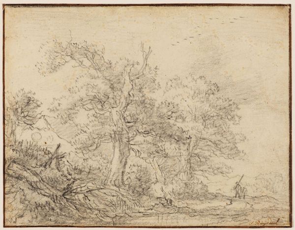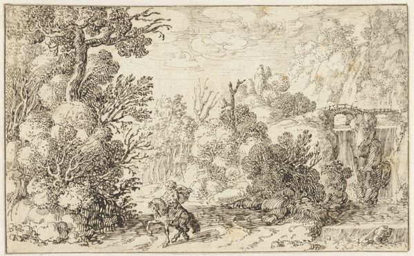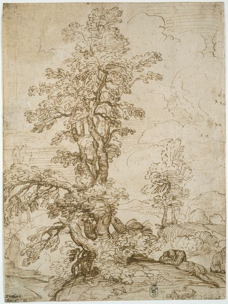 This landscape, made by Annibale Carracci, is rendered with pen and brown ink on paper. The relatively simple materials belie a complex set of decisions made by the artist. The strokes of ink create depth and texture, guiding our eye through the scene. Notice the delicate rendering of the trees in the foreground, built up from multiple, short lines. In contrast, the clouds are formed by more flowing, expressive marks. The choice of pen and ink allowed Carracci to achieve a balance between precision and spontaneity. This wasn't just sketching; it was a deliberate process of observing nature and translating it through skilled handwork. Although the landscape appears timeless, the act of drawing—of capturing the world through simple tools—is deeply rooted in human labor. Recognizing the art of drawing as work gives us new appreciation for the artist's skill, and how traditional techniques can be elevated. It's a reminder that even in a seemingly effortless sketch, the hand of the artist plays a crucial role.